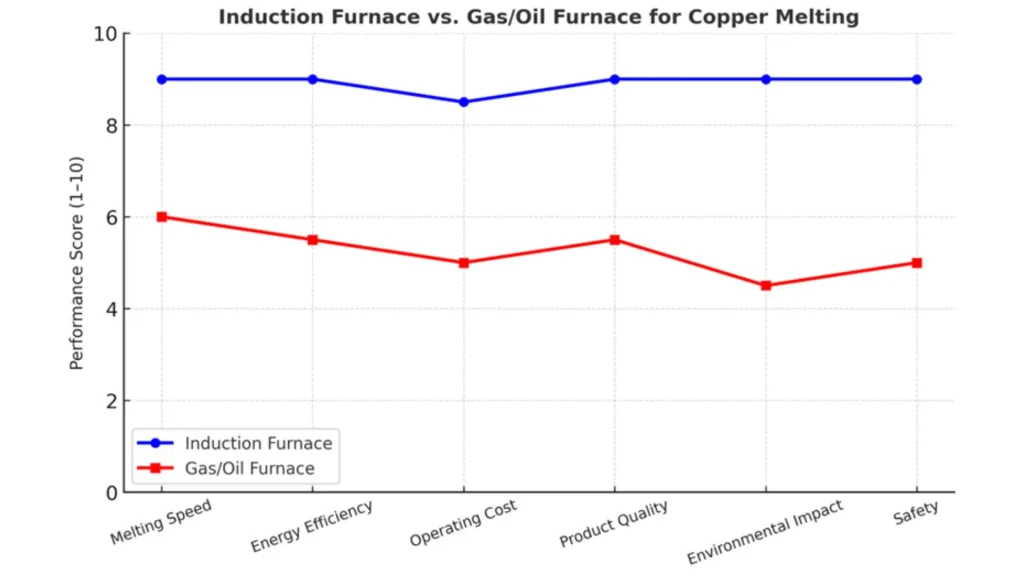 As illustrated above, an induction furnace copper melting system outperforms gas or oil furnaces across all key performance metrics — including efficiency, safety, and product quality.