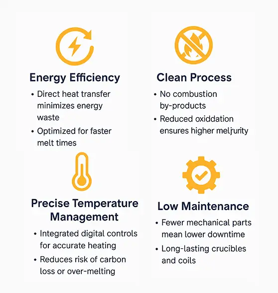 Unlike combustion-based systems, induction furnaces use no flames or fuel. This offers significant advantages: